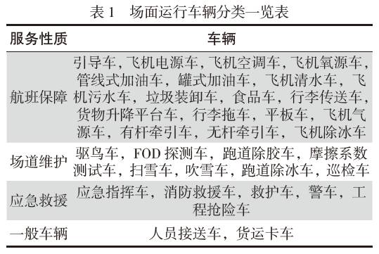 為保障航班運行,飛行區內存在不同類型作業車輛,大致可分為4 類(如表1 所示),這4 類車輛有著不同的運行模式。