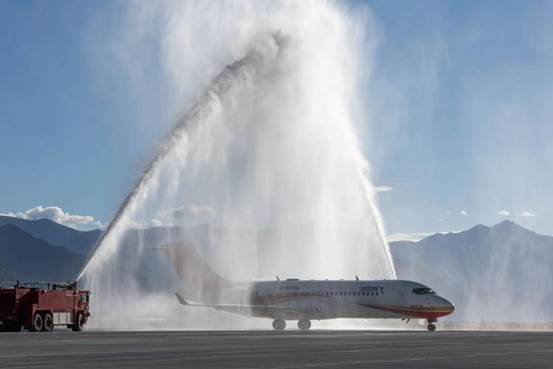 西藏拉薩貢嘎國(guó)際機(jī)場(chǎng)用“水門(mén)”迎接國(guó)產(chǎn)大飛機(jī)